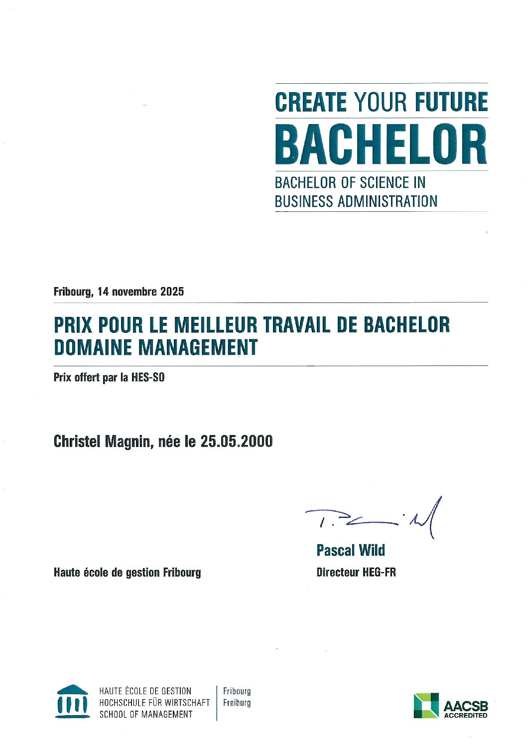 - Prix du meilleur travail de bachelor domaine management
