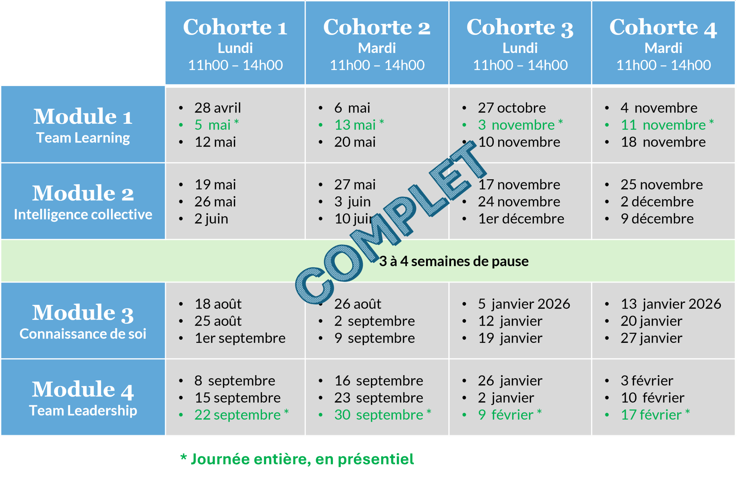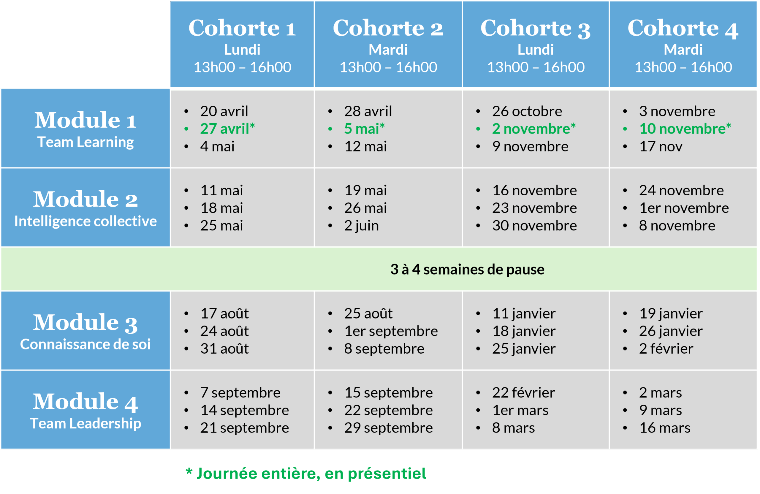 Vous pouvez passer librement d’une cohorte à l’autre en cas d’empêchement.